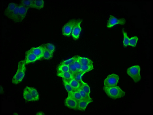 Immunofluorescence staining of A549 cells with CSB-MA018072A1m at 1:215, counter-stained with DAPI. The cells were blocked in 10% normal Goat Serum and then incubated with the primary antibody overnight at 4°C. The secondary antibody was Alexa Fluor 488-congugated AffiniPure Goat Anti-Mouse IgG(H+L).
