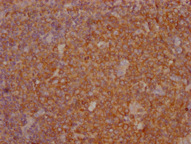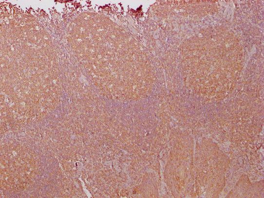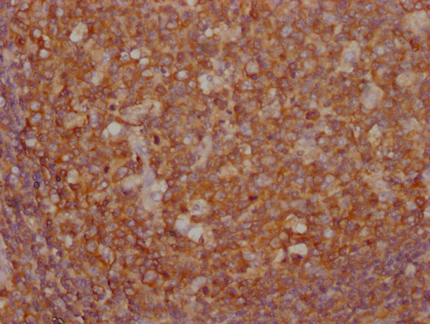 IHC image of CSB-MA018072A1m diluted at 1:1000 and staining in paraffin-embedded human tonsil tissue performed on a Leica BondTM system. After dewaxing and hydration, antigen retrieval was mediated by high pressure in a citrate buffer (pH 6.0). Section was blocked with 10% normal goat serum 30min at RT. Then primary antibody (1% BSA) was incubated at 4°C overnight. The primary is detected by a biotinylated secondary antibody and visualized using an HRP conjugated SP system.