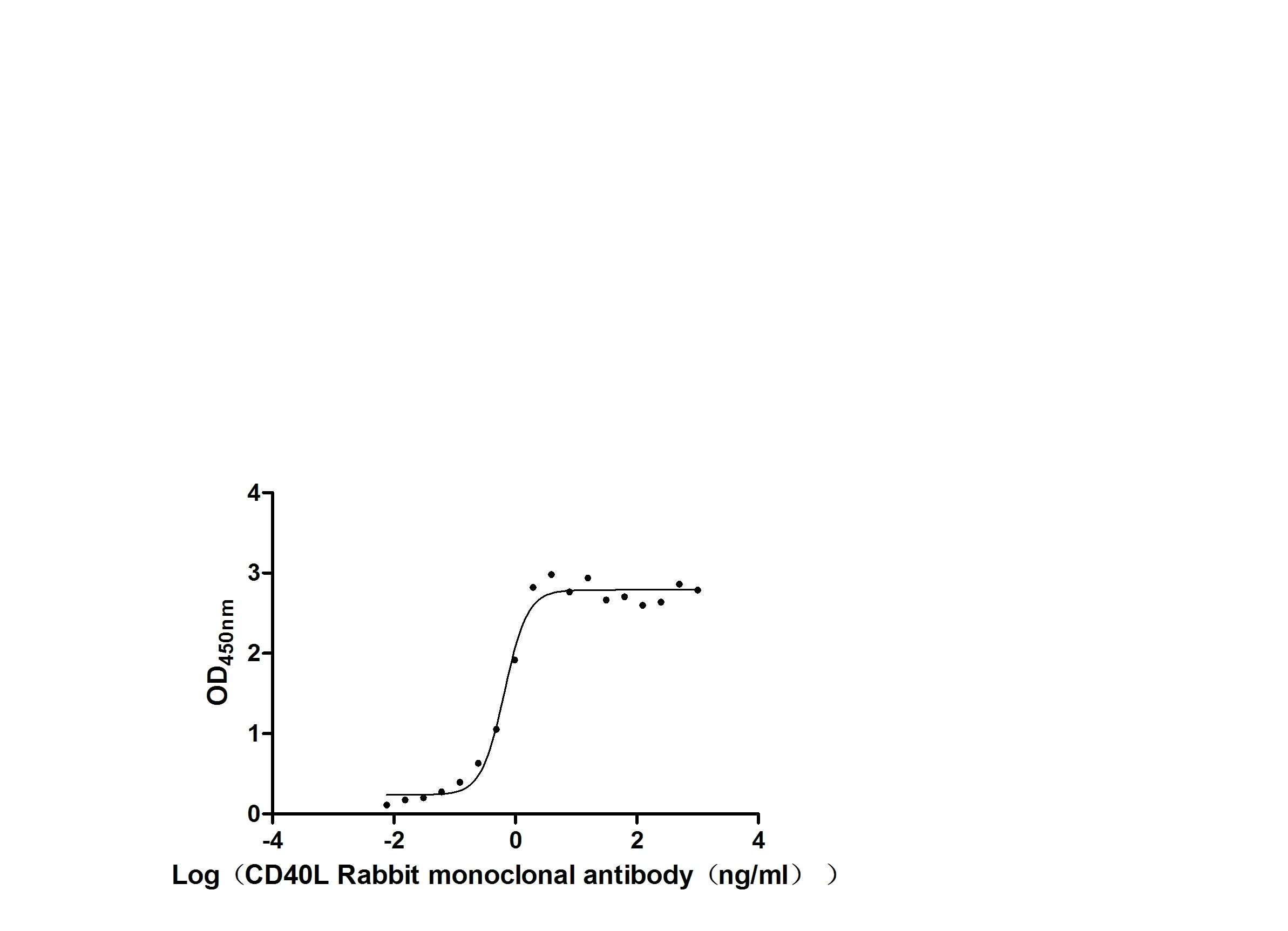 Measured by its binding ability in a functional ELISA. Immobilized CD40L at 2 μg/ml can bind Anti- CD40L Rabbit Monoclonal Antibody(CSB-RA156386A0HU), the EC50 is 2.353-3.232 ng/ml. Biological Activity Assay -