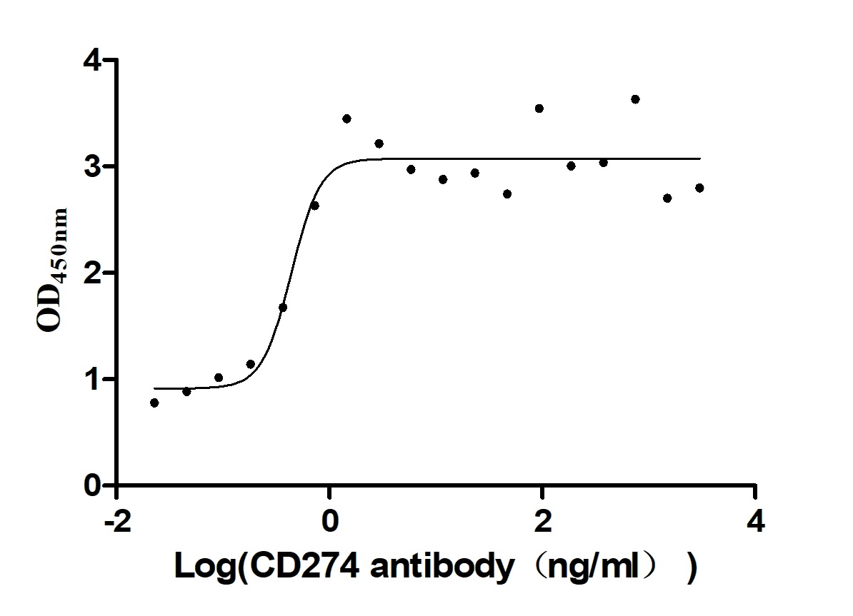 Measured by its binding ability in a functional ELISA. Immobilized PD-L1 at 2 μg/ml can bind Anti- PD-L1 mouse monoclonal antibody(CSB-MA878942A1m,antigen from E.coli), the EC50 of human PD-L1 protein is 1.252-1.653 ng/mL. Biological Activity Assay -