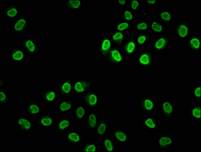 Immunofluorescence staining of Hela cells (treated with 30mM sodium butyrate for 4h) with CSB-PA010429OA20acHU at 1:2.5, counter-stained with DAPI. The cells were fixed in 4% formaldehyde, permeabilized using 0.2% Triton X-100 and blocked in 10% normal Goat Serum. The cells were then incubated with the antibody overnight at 4°C. The secondary antibody was Alexa Fluor 488-congugated AffiniPure Goat Anti-Rabbit IgG(H+L).