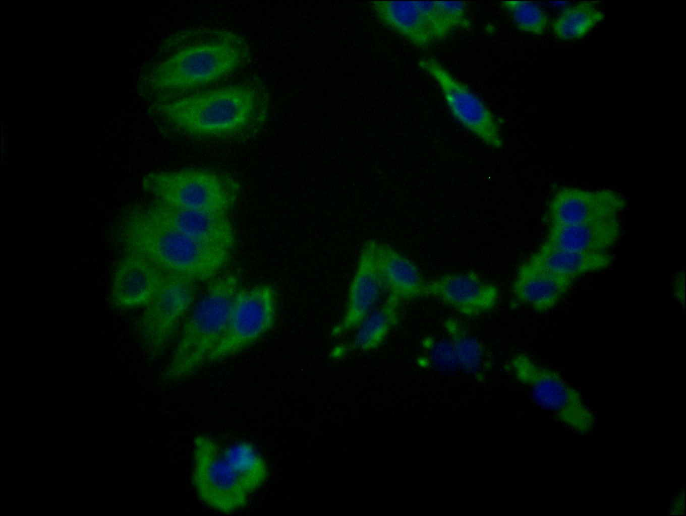 Immunofluorescence staining of HepG2 cell with CSB-PA883443ESR2HU at 1:40, counter-stained with DAPI. The cells were fixed in 4% formaldehyde and blocked in 10% normal Goat Serum. The cells were then incubated with the antibody overnight at 4C. The secondary antibody was Alexa Fluor 488-congugated AffiniPure Goat Anti-Rabbit IgG(H+L).
