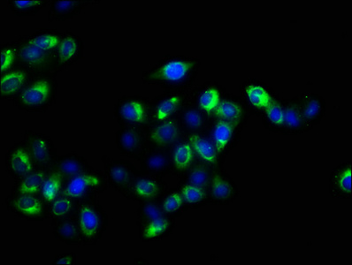 Immunofluorescence staining of Hela cells with CSB-PA004940LA01HU at 1:100, counter-stained with DAPI. The cells were fixed in 4% formaldehyde, permeabilized using 0.2% Triton X-100 and blocked in 10% normal Goat Serum. The cells were then incubated with the antibody overnight at 4°C. The secondary antibody was Alexa Fluor 488-congugated AffiniPure Goat Anti-Rabbit IgG(H+L).