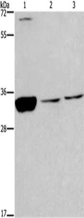Gel: 8%SDS-PAGE,Lysate: 40 μg,Lane 1-3: Jurkat cells, Hela cells, HT-29 cells,Primary antibody: CSB-PA952871(CDK1 Antibody) at dilution 1/300 dilution,Secondary antibody: Goat anti rabbit IgG at 1/8000 dilution,Exposure time: 5 minutes