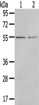 Gel: 8%SDS-PAGE,Lysate: 40 μg,Lane 1-2: 293T cells, Human normal kidney tissue,Primary antibody: CSB-PA584727(CHRDL1 Antibody) at dilution 1/400 dilution,Secondary antibody: Goat anti rabbit IgG at 1/8000 dilution,Exposure time: 3 minutes