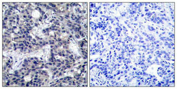 Immunohistochemical analysis of paraffin-embedded human breast carcinoma tissue using PKR(Ab-446) Antibody(left) or the same antibody preincubated with blocking peptide(right).