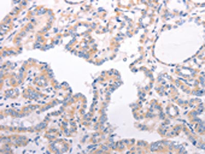The image on the left is immunohistochemistry of paraffin-embedded Human thyroid cancer tissue using CSB-PA225678(F9 Antibody) at dilution 1/45, on the right is treated with fusion protein. (Original magnification: ×200)