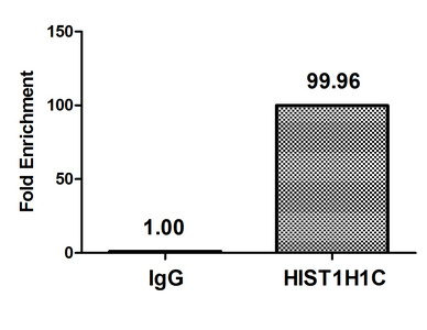 Chromatin Immunoprecipitation Hela (4*106) were treated with Micrococcal Nuclease, sonicated, and immunoprecipitated with 5µg anti-HIST1H1C (CSB-PA010378OA45nme1HU) or a control normal rabbit IgG. The resulting ChIP DNA was quantified using real-time PCR with primers against the β-Globin promoter.