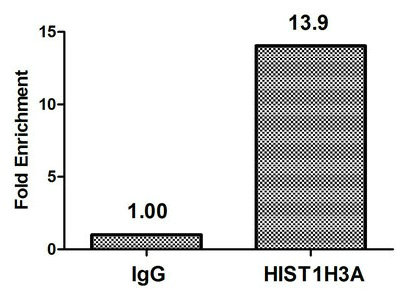 Chromatin Immunoprecipitation Hela (4*106) were treated with Micrococcal Nuclease, sonicated, and immunoprecipitated with 8µg anti-HIST1H3A (CSB-PA010418OA36nme1HU) or a control normal rabbit IgG. The resulting ChIP DNA was quantified using real-time PCR with primers against the β-Globin promoter.