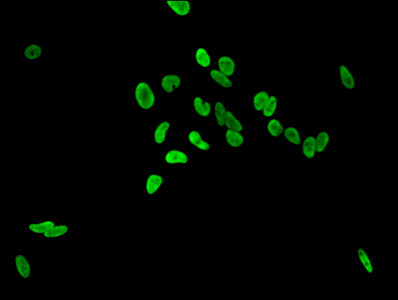 Immunofluorescent analysis of Hela cells using CSB-PA010418OA36nme1HU at dilution of 1:100 and Alexa Fluor 488-congugated AffiniPure Goat Anti-Rabbit IgG(H+L)