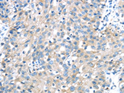 The image on the left is immunohistochemistry of paraffin-embedded Human thyroid cancer tissue using CSB-PA824414(IGFBP3 Antibody) at dilution 1/40, on the right is treated with synthetic peptide. (Original magnification: ×200)