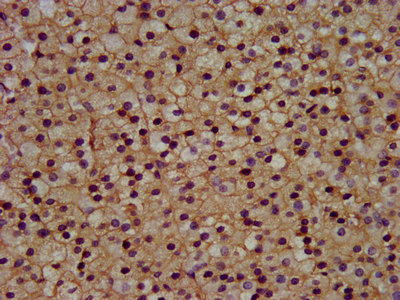 IHC image of CSB-PA012058LA01HU diluted at 1:300 and staining in paraffin-embedded human adrenal gland tissue performed on a Leica BondTM system. After dewaxing and hydration, antigen retrieval was mediated by high pressure in a citrate buffer (pH 6.0). Section was blocked with 10% normal goat serum 30min at RT. Then primary antibody (1% BSA) was incubated at 4°C overnight. The primary is detected by a biotinylated secondary antibody and visualized using an HRP conjugated SP system.