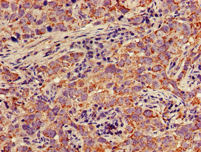 IHC image of CSB-PA013409LA01HU diluted at 1:300 and staining in paraffin-embedded human pancreatic cancer performed on a Leica BondTM system. After dewaxing and hydration, antigen retrieval was mediated by high pressure in a citrate buffer (pH 6.0). Section was blocked with 10% normal goat serum 30min at RT. Then primary antibody (1% BSA) was incubated at 4°C overnight. The primary is detected by a biotinylated secondary antibody and visualized using an HRP conjugated SP system.
