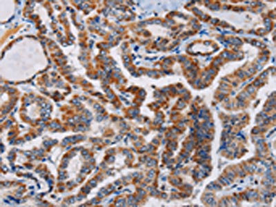 The image on the left is immunohistochemistry of paraffin-embedded Human thyroid cancer tissue using CSB-PA906272(PLCB3 Antibody) at dilution 1/40, on the right is treated with synthetic peptide. (Original magnification: ×200)