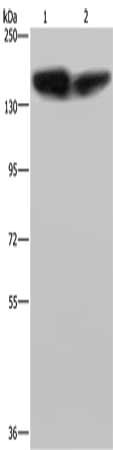 Gel: 6%SDS-PAGE, Lysate: 40 μg, Lane 1-2: A431 cells, PC3 cells, Primary antibody: CSB-PA906272(PLCB3 Antibody) at dilution 1/200, Secondary antibody: Goat anti rabbit IgG at 1/8000 dilution, Exposure time: 3 minutes