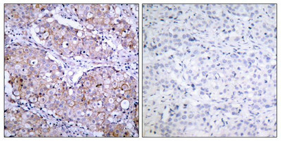 Immunohistochemical analysis of paraffin-embedded human breast carcinoma tissue using EGFR(Phospho-Ser1070) Antibody(left) or the same antibody preincubated with blocking peptide(right).