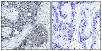 Immunohistochemical analysis of paraffin-embedded human breast carcinoma tissue using eIF4E(Phospho-Ser209) Antibody(left) or the same antibody preincubated with blocking peptide(right).