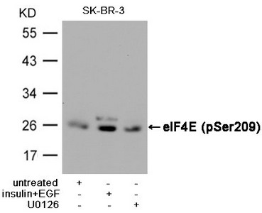 Western blot analysis of extracts from SK-BR-3 cells, untreated or insulin and EGF treated, and pretreated with U0126 cells, using eIF4E (Phospho-Ser209) Antibody.