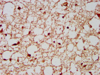 IHC image of CSB-PA407385LA01HU diluted at 1:200 and staining in paraffin-embedded human brain tissue performed on a Leica BondTM system. After dewaxing and hydration, antigen retrieval was mediated by high pressure in a citrate buffer (pH 6.0). Section was blocked with 10% normal goat serum 30min at RT. Then primary antibody (1% BSA) was incubated at 4°C overnight. The primary is detected by a biotinylated secondary antibody and visualized using an HRP conjugated SP system.
