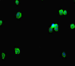 Immunofluorescent analysis of HepG2 cells using CSB-PA020563LA01HU at dilution of 1:100 and Alexa Fluor 488-congugated AffiniPure Goat Anti-Rabbit IgG(H+L)