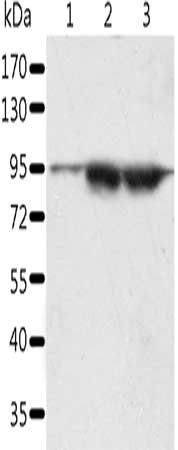 Gel: 10%SDS-PAGE, Lysate: 60 μg, Lane 1-3: A549 cells, lncap cells, human seminoma tissue, Primary antibody: CSB-PA928166(SPATA20 Antibody) at dilution 1/1000, Secondary antibody: Goat anti rabbit IgG at 1/8000 dilution, Exposure time: 5 minutes