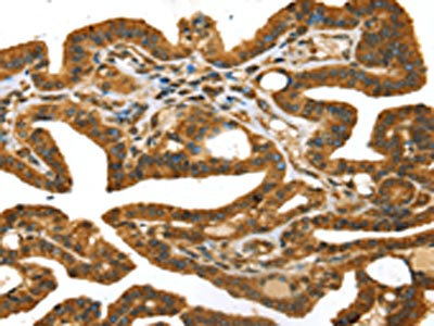 The image on the left is immunohistochemistry of paraffin-embedded Human thyroid cancer tissue using CSB-PA022994(STX11 Antibody) at dilution 1/30, on the right is treated with fusion protein. (Original magnification: ×200)