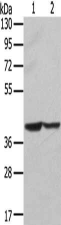 Gel: 8%SDS-PAGE, Lysate: 40 μg, Lane 1-2: Hela cells, hepg2 cells, Primary antibody: CSB-PA560536(STX16 Antibody) at dilution 1/400, Secondary antibody: Goat anti rabbit IgG at 1/8000 dilution, Exposure time: 5 seconds