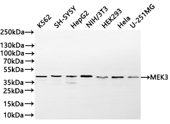 Positive WB detected in: K562 whole cell lysate(20μg),SH-SY5Y whole cell lysate(20μg), HepG2 whole cell lysate(20μg), NIH/3T3 whole cell lysate(20μg),HEK293 whole cell lysate(20μg),Hela whole cell lysate(20μg),U-251MG whole cell lysate(20μg)