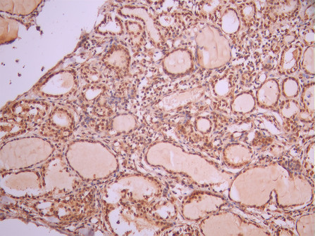 IHC image of CSB-RA562365A0HU diluted at 1:100 and staining in paraffin-embedded human thyroid tissue performed on a Leica BondTM system. After dewaxing and hydration, antigen retrieval was mediated by high pressure in a citrate buffer (pH 6.0). Section was blocked with 10% normal goat serum 30min at RT. Then primary antibody (1% BSA) was incubated at 4°C overnight. The primary is detected by a Goat anti-rabbit polymer IgG labeled by HRP and visualized using 0.05% DAB.