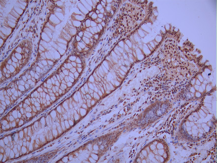 IHC image of CSB-RA562365A0HU diluted at 1:100 and staining in paraffin-embedded human colorectal cancer performed on a Leica BondTM system. After dewaxing and hydration, antigen retrieval was mediated by high pressure in a citrate buffer (pH 6.0). Section was blocked with 10% normal goat serum 30min at RT. Then primary antibody (1% BSA) was incubated at 4°C overnight. The primary is detected by a Goat anti-rabbit polymer IgG labeled by HRP and visualized using 0.05% DAB.
