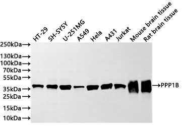 Positive WB detected in: HT-29 whole cell lysate(30μg),SH-SY5Y whole cell lysate(30μg),U-251MG whole cell lysate(30μg),A549 whole cell lysate(30μg),Hela whole cell lysate(30μg),A431 whole cell lysate(30μg),Jurkat whole cell lysate(30μg), Mouse brain tissue lysate(30μg), Rat brain tissue lysate(30μg)