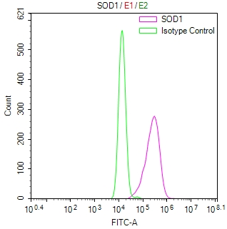 Overlay Peak curve showing Hela cells stained with CSB-RA022397MA1HU (red line) at 1:50. The cells were fixed in 4% formaldehyde (15min) and permeated by 0.2% TritonX-100 for 10min. Then 10% normal goat serum to block non-specific protein-protein interactions followed by the antibody (1ug/1*106cells) for 45min at 4℃. The secondary antibody used was FITC-conjugated Goat Anti-Mouse IgG(H+L) at 1/200 dilution for 35 min at 4°C. Isotype control antibody (green line) was mouse IgG1 (1μg/1*106cells) used under the same conditions. Acquisition of >10,024 events was performed.