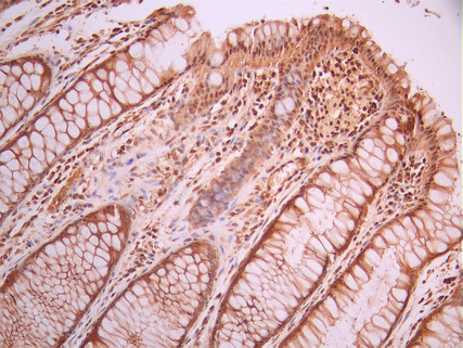 IHC image of CSB-RA101412A0HU diluted at 1:100 and staining in paraffin-embedded human colorectal cancer performed on a Leica BondTM system. After dewaxing and hydration, antigen retrieval was mediated by high pressure in a citrate buffer (pH 6.0). Section was blocked with 10% normal goat serum 30min at RT. Then primary antibody (1% BSA) was incubated at 4°C overnight. The primary is detected by a Goat anti-rabbit polymer IgG labeled by HRP and visualized using 0.05% DAB.