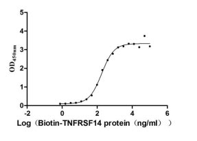 E. coli biotin ligase (BirA) is highly specific in covalently attaching biotin to the 15 amino acid AviTag peptide. This recombinant protein was biotinylated in vivo by AviTag-BirA technology, which method is BriA catalyzes amide linkage between the biotin and the specific lysine of the AviTag.
