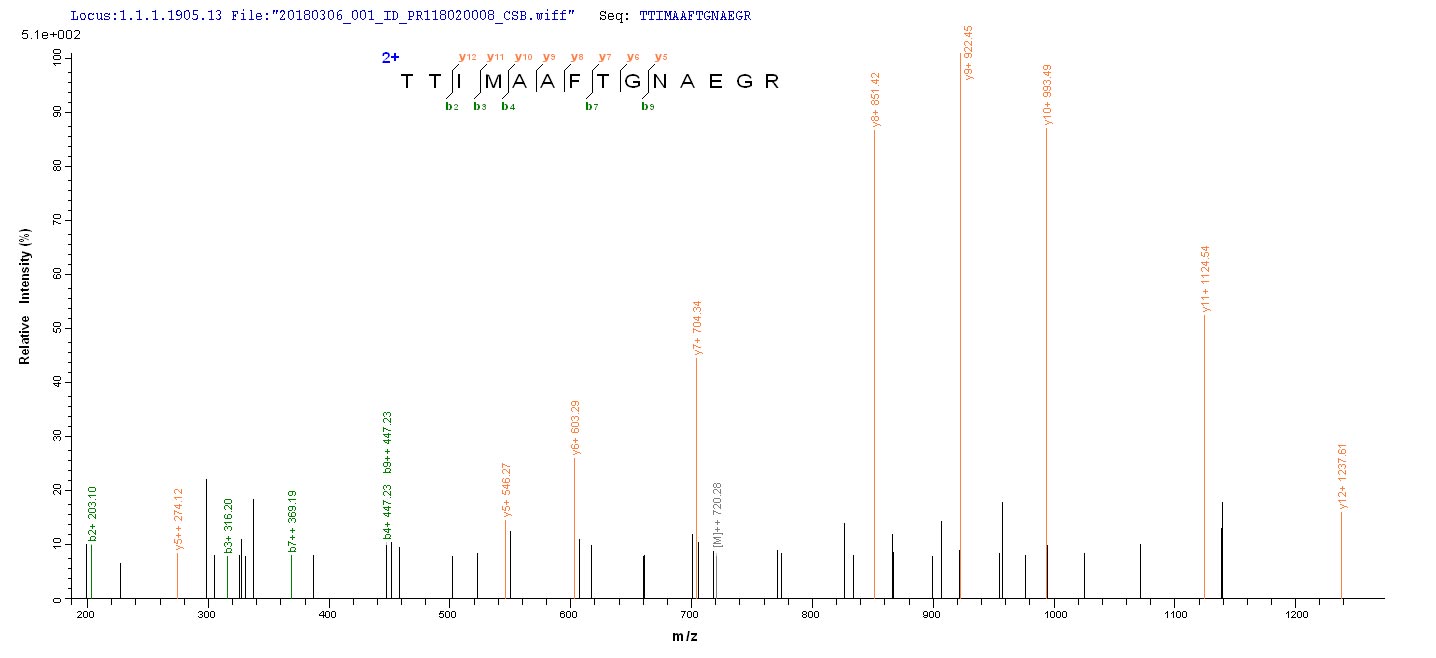 Based on the SEQUEST from database of E.coli host and target protein, the LC-MS/MS Analysis result of CSB-EP323566IEC could indicate that this peptide derived from E.coli-expressed Influenza A virus (strain A/Fort Warren/1/1950 H1N1) NP.