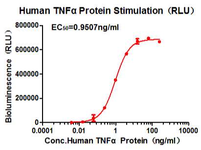 Response to human TNFα protein (RLU). The NF-kB (Luc) HEK293T Reporter Cell was stimulated with serial dilutions of human TNFα protein. The EC50 was approximately 0.9507 ng/mL.