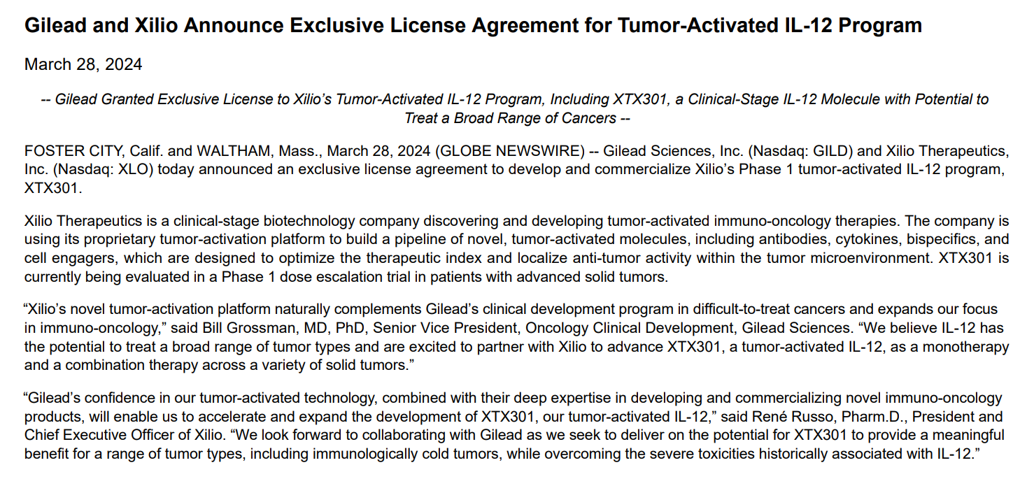 3月28日,吉利德科學(GILD US)和Xilio Therapeutics宣布達成一項獨家許可協議,雙方將共同開發和商業化后者的腫瘤激活白介素12(IL-12)