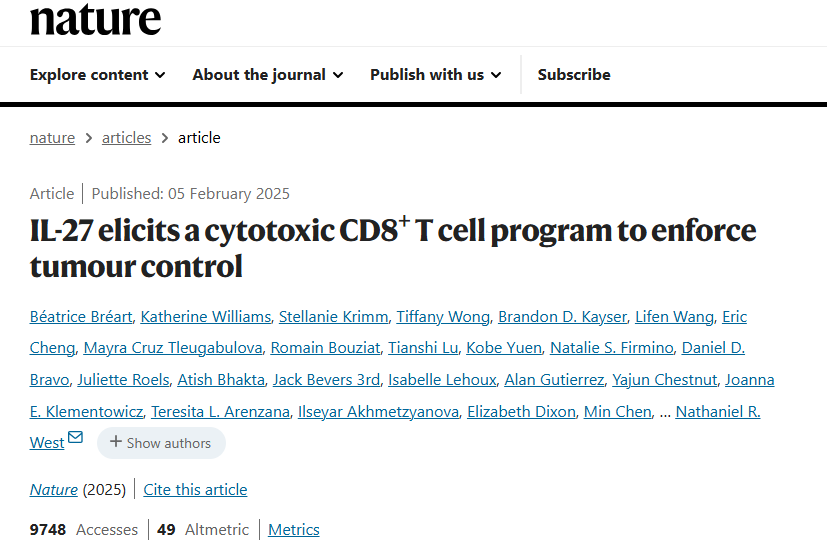 01 靶點:IL-27應用:結直腸癌、肺癌等癌癥潛在治療靶點來源:IL-27 elicits a cytotoxic CD8 + T cell program to enforce tum