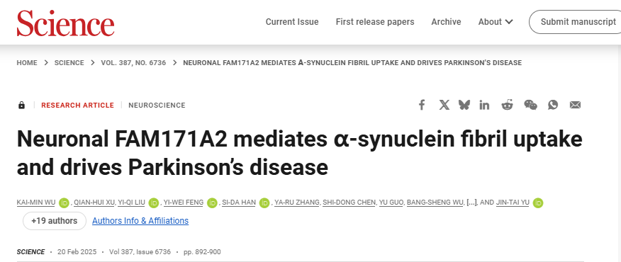 靶點FAM171A2應用:帕金森病全新治療靶點來源:Neuronal FAM171A2 mediates α-synuclein fibril uptake and drives Parkinson s disease Science,2025 Feb 21