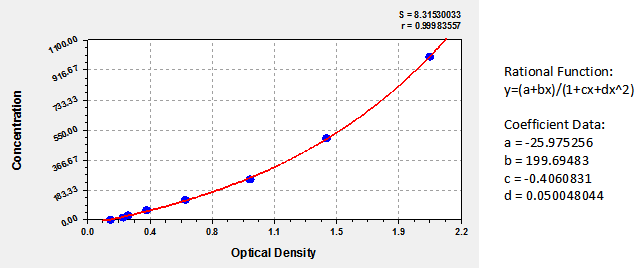 通過標(biāo)準(zhǔn)品的OD及濃度值,運(yùn)用Curve Expert 1.4 軟件,繪制標(biāo)準(zhǔn)曲線,如下: